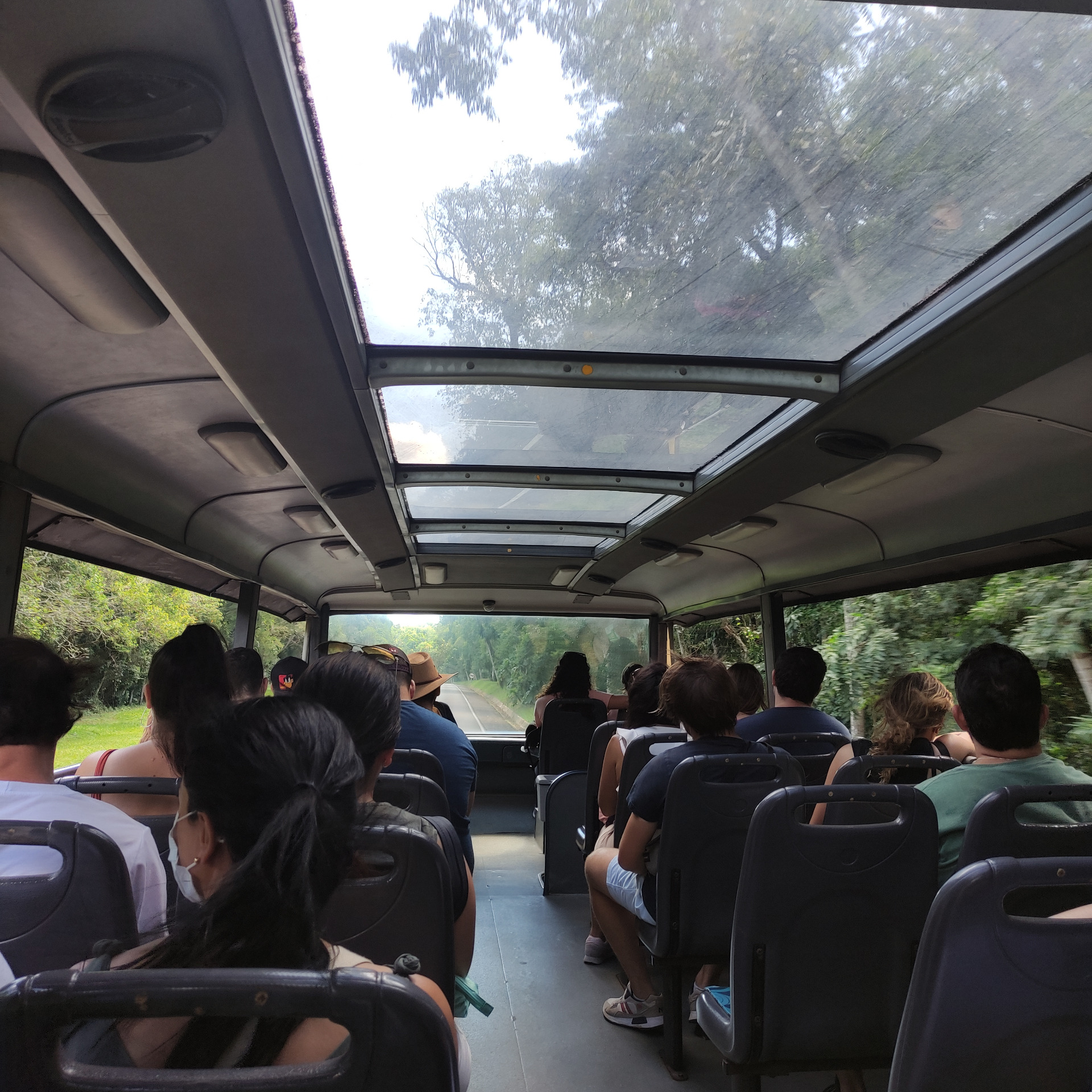 Έχει λεωφορείο που σας μεταφέρει έπειτα μέσα στο εθνικό πάρκο σε μια καταπράσινη και όμορφη διαδρομή . Αν θέλετε να περπατήσετε στο μονοπάτι παράλληλα με τους καταρράκτες πρέπει να σταματήσετε στην δεύτερη στάση μπροστά από το Hotel das Cataratas με το ιδιαίτερο ροζ χρώμα .